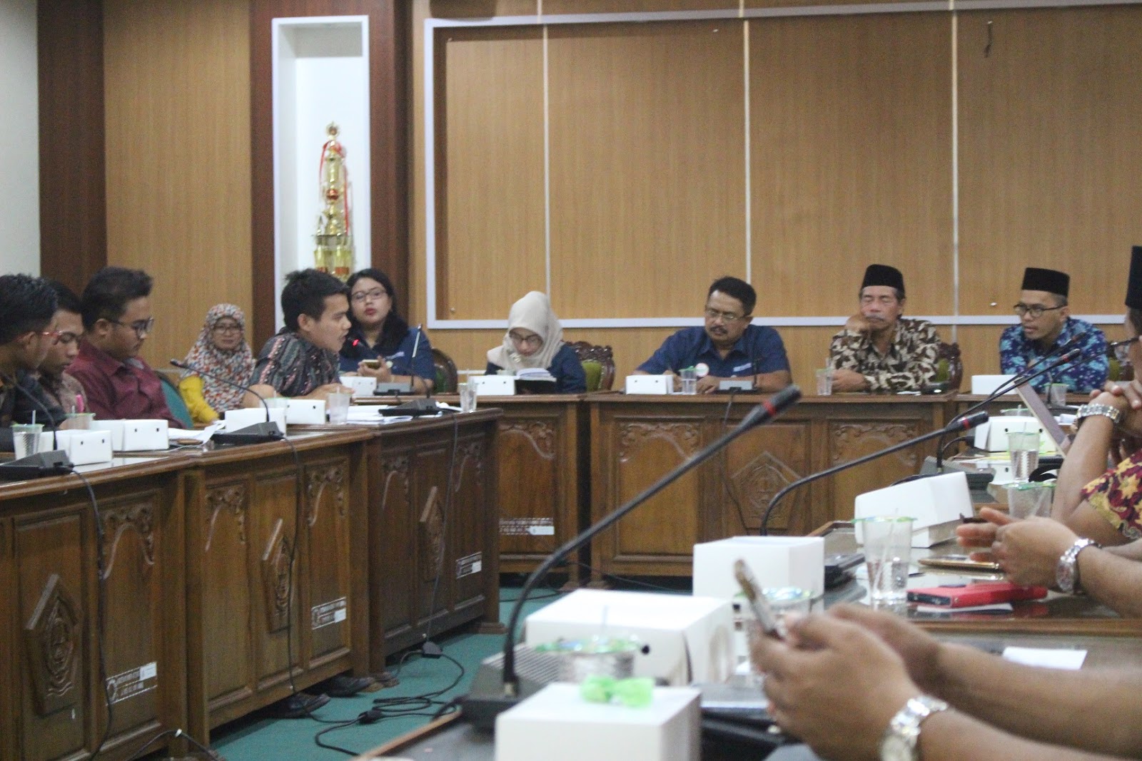 | Seorang mahsiswa menyampaikan aspirasinya dalam audiensi yang berlangsung di Gedung Rektorat lantai III UIN Walisongo Semarang, Kamis (04/01/2018). |