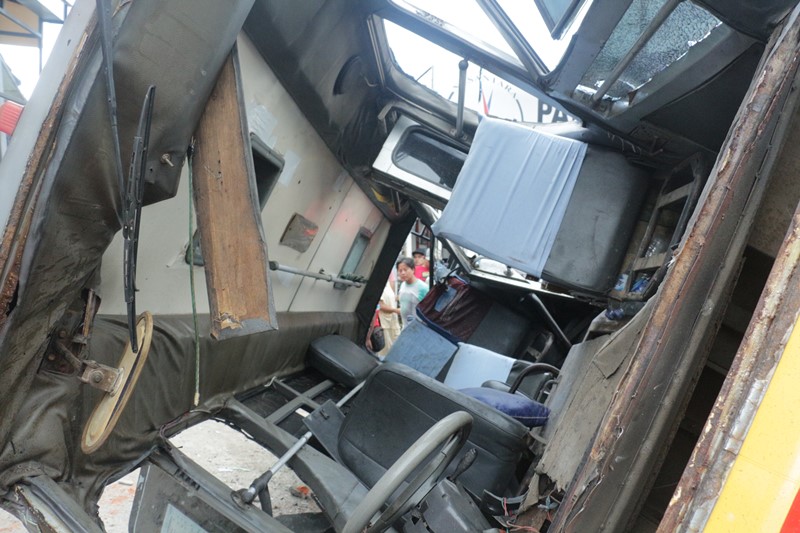 Rusak Parah: Bus yang sebelumnya mengangkut penumpang mayoritas anak pulang sekolah ini mengalami kerusakan cukup parah akibat diseruduk truk kontainer dari arah belakang. (Amanat/M.S.Najib)