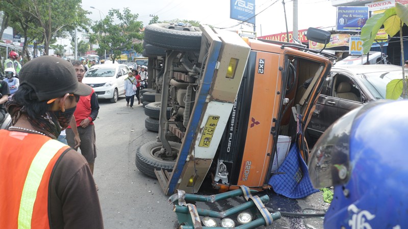 Kontainer Terguling: Di duga mengalami rem blong, truk dari arah mijen ini tergeling setelah menabrak sejumlah kendaran di turunan Silayur, pada Kamis (2/3). (Amanat/M.S.Najib)