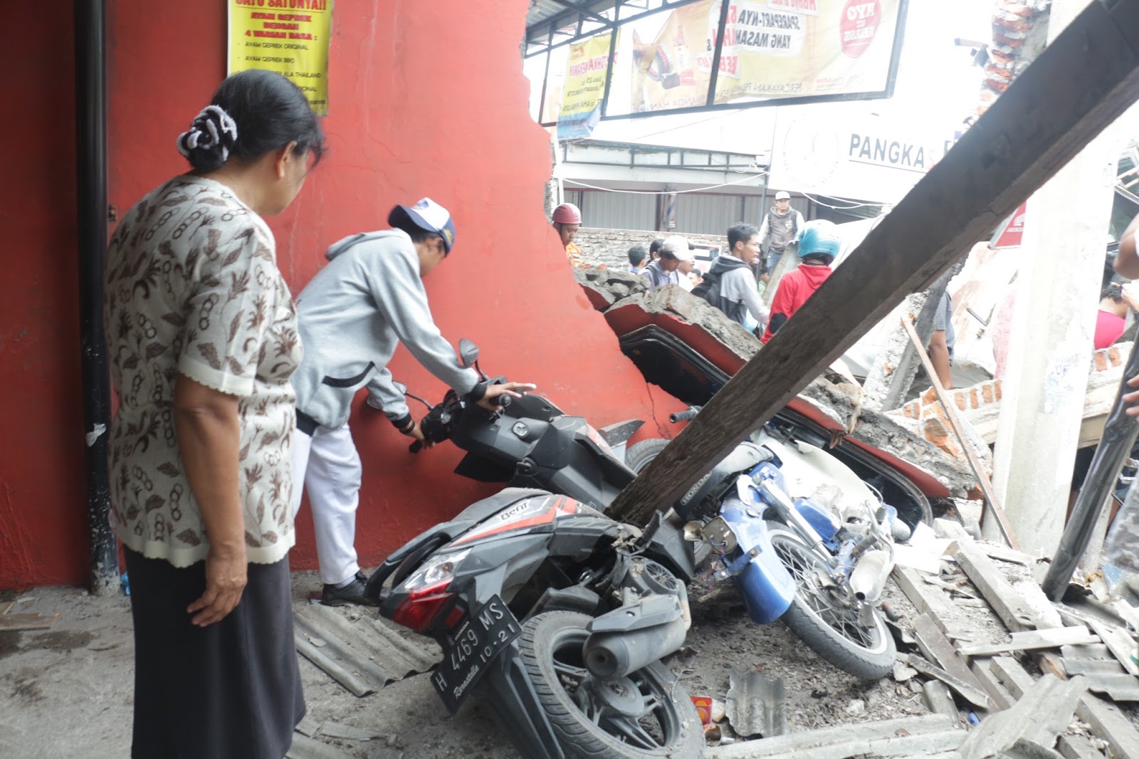 Rubuh: sebagian bangunan bengkel AHASS rubuh akibat kecelekaan karombol antara truk kontainer dan sejumlah kendaraan. Beberapa motor yang terparkir disekitar bangunan pun mengalami kerusakan karena kejadian ini. (Amanat/M.S.Najib)
