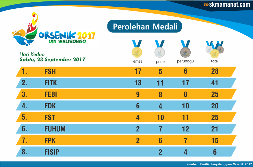 Skmamanat.com – Hari kedua penyelenggaraan Orientasi Olahraga, Seni, Ilmiah dan Ketrampilan (Orsenik) 2017, terjadi perubahan klasemen peroleh medali terbanyak, Sabtu (24/09/2017).