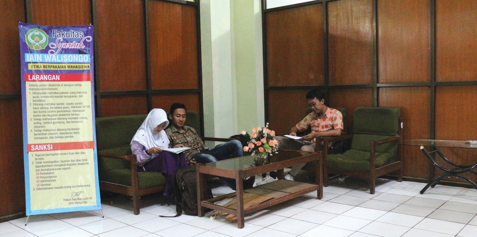 | Tiga orang mahasiswa sedang menunggu dosen pembimbing skripsi di Ruang tunggu Fakultas Syariah UIN Walisongo Semarang |