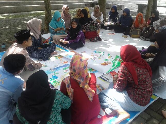 Sejumlah 31 mahasiswa semester enam prodi PIAUD terlihat duduk bersila beralaskan tikar di Taman Jati Kampus 2. Mereka sibuk menggambar secara berkelompok dengan tema dunia anak-anak.