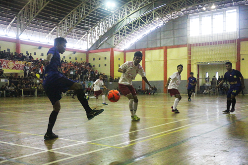 | Pemain tim futsal FSH mengontrol bola saat menghadapi tim futsal FEBI di partai final Orsenik 2017, Ahad (24/09/2017). (Amanat/M. S. Najib) |