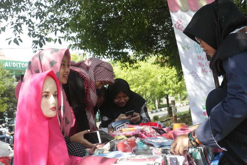 | Layani Pembeli: Mahasiswi penjual jilbab membuka lapak dalam gelaran Wednesday Market di depan perpustakaan pusat UIN Walisongo, Rabu (1/3). (Amanat/Najib) |